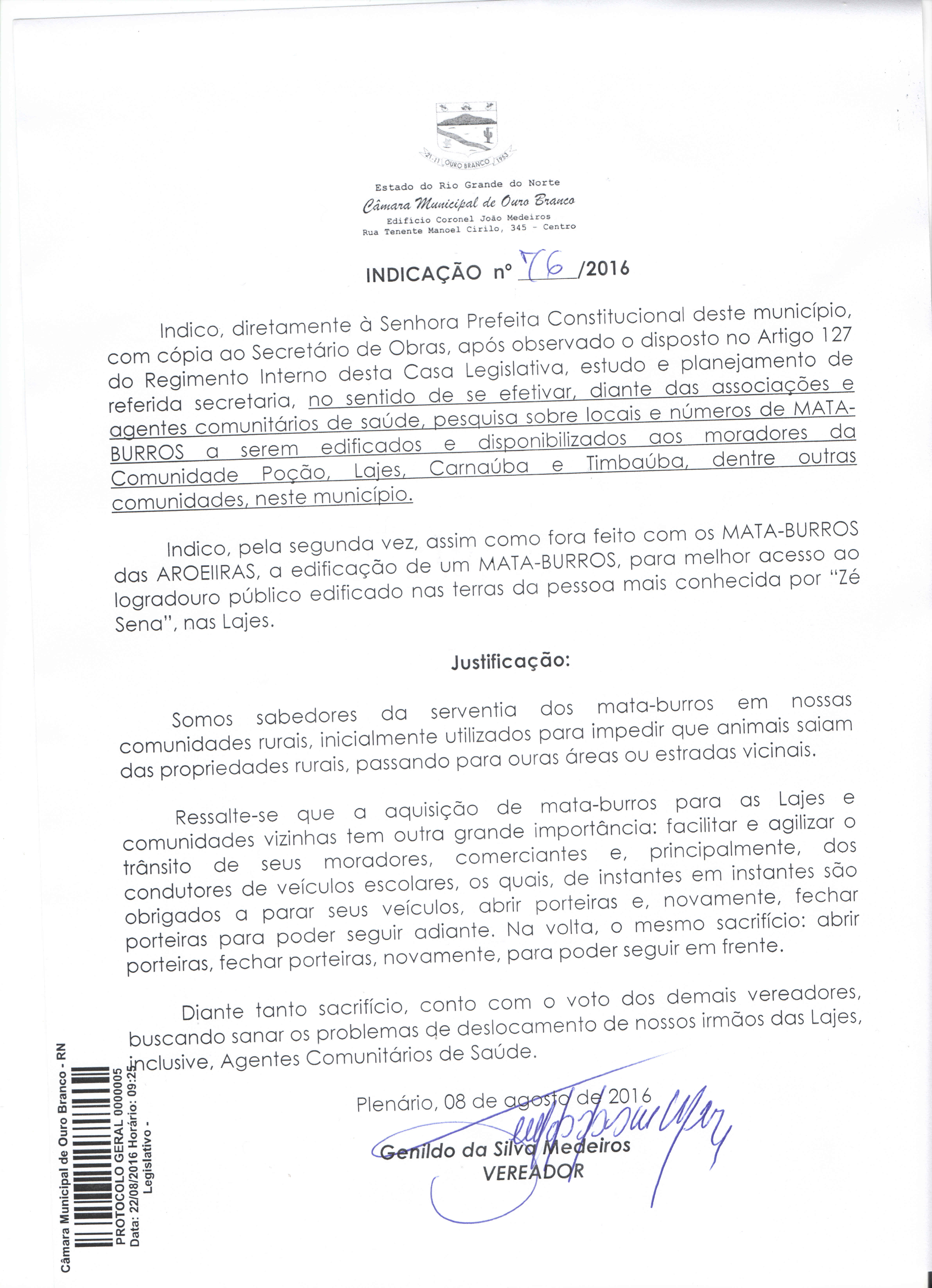 ![]() INDICA A CONSTRUÇÃO DE UM POSTO DE SAÚDE, UMA PASSAGEM MOLHADA NO RIACHO DO POÇÃO E UM MATA-BURRO QUE DÁ ACESSO A VILA AVELINO AO COLÉGIO LAGES, ALÉM DA RECUPERAÇÃO DA PASSAGEM MOLHADA NO RIO QUIPAUÁ.